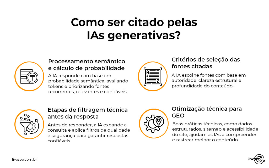 Em vez de simplesmente “buscar palavras-chave”, a IA tenta entender o significado da pergunta e construir a resposta mais coerente possível com base nos padrões que aprendeu. Abaixo estão os principais critérios e etapas que influenciam quais conteúdos são utilizados e citados pelas IAs generativas.