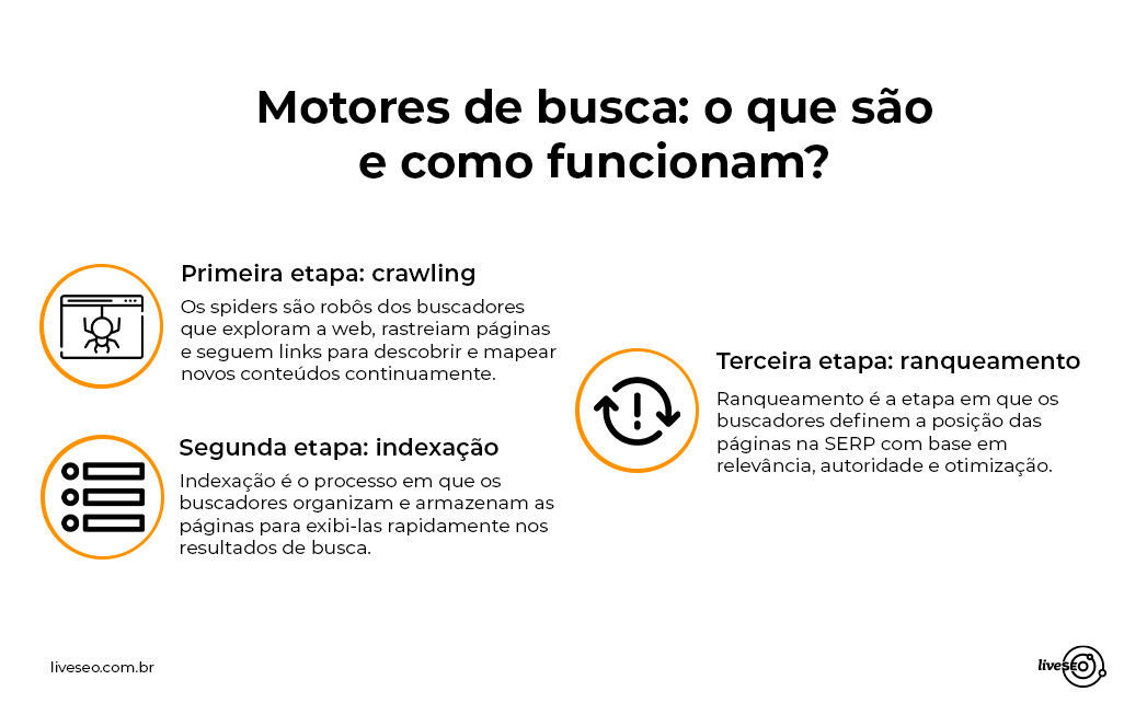 Os motores de busca são ferramentas responsáveis por rastrear, organizar e classificar conteúdos da internet. Eles determinam quais resultados aparecerão na SERP e sua posição, buscando sempre corresponder à intenção de busca do usuário. Esse processo envolve 3 etapas principais: