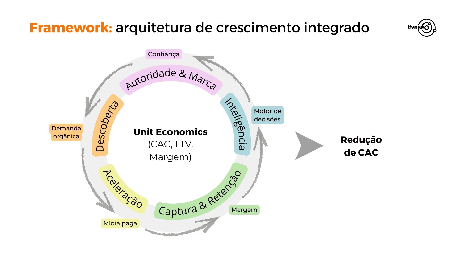 Quando há integração, cria-se um fluxo virtuoso: a autoridade de marca gera confiança. Essa confiança aumenta a taxa de clique e conversão, e isso potencializa o desempenho do SEO. O SEO, por sua vez, estabiliza o tráfego orgânico e reduz a dependência de mídia paga. Com uma base sólida construída, a mídia paga passa a atuar como acelerador do que já funciona, não como sustentação da operação.