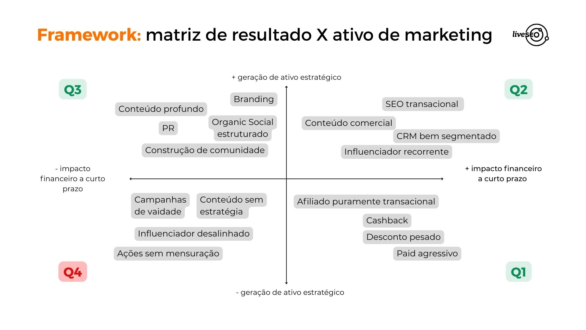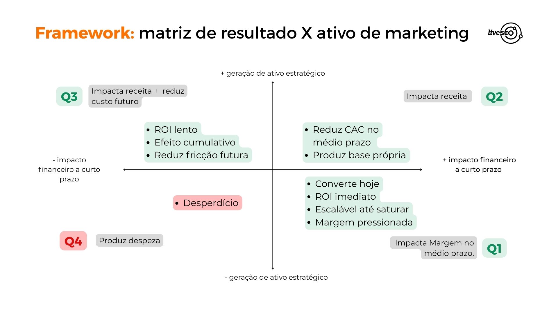 Este quadrante envolve branding, relações públicas e conteúdos aprofundados. O retorno financeiro pode ser mais lento, mas o efeito acumulado é significativo. Essas ações são responsáveis por construir reputação, reduzir a fricção na compra e aumentam as chances de a marca ser citada por IAs e mecanismos de busca tradicionais, tornando-se uma referência no mercado