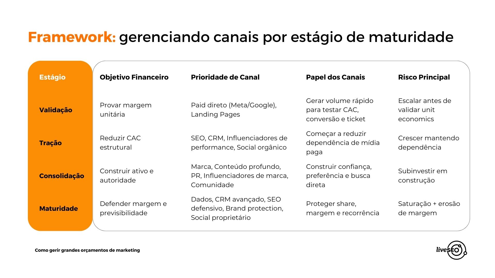 Organizamos o framework apresentado no webinar em quatro estágios práticos para orientar a alocação de grandes orçamentos de marketing de forma estratégica e sustentável: